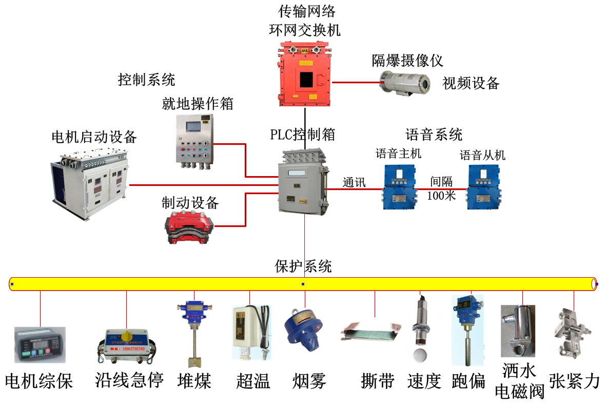本系統(tǒng)主要由PLC控制、視頻監(jiān)控、皮帶綜合保護、預警通話、運行參數(shù)監(jiān)測與數(shù)據(jù)分析、傳輸網(wǎng)絡等模塊組成。PLC控制系統(tǒng)的下位機選用西門子S7系列產(chǎn)品,皮帶保護系統(tǒng)配備堆煤保護、沿線急停保護、超溫保護、煙霧保護、縱撕保護、速度保護、跑偏保護、張緊力下降保護、超溫灑水等9大保護,同時具備電機電流、電機溫度、電機振動、煤倉倉位檢測;語音系統(tǒng)配置我公司自主研發(fā)的KXH127型數(shù)字語音機,具備開車預警、故障語音提示、語音對講功能;電視監(jiān)控系統(tǒng)中的礦用攝像儀采用海康高清機芯,集控室視頻設備以??灯放茷橹黧w。整個系統(tǒng)集“控”、“視”、“聽”為一體。圖a、圖b為本系統(tǒng)構架示意圖。