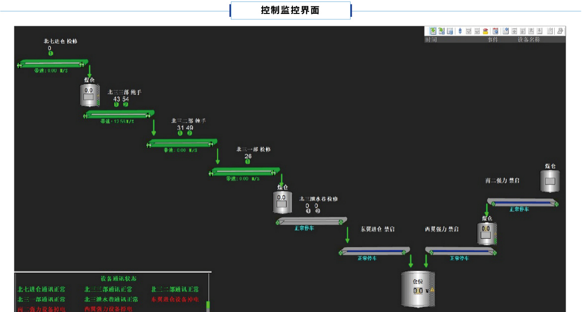 在集控室的上位機上,實時顯示皮帶運輸系統(tǒng)的各種信息,包括:系統(tǒng)各保護傳感器的工作狀態(tài)(按各傳感器的準確位置顯示)、電動機運行返回接點狀態(tài)、電機電流、電機溫度、張緊力、煤倉倉位、皮帶停車原因、PLC控制分站通訊狀態(tài)等等。