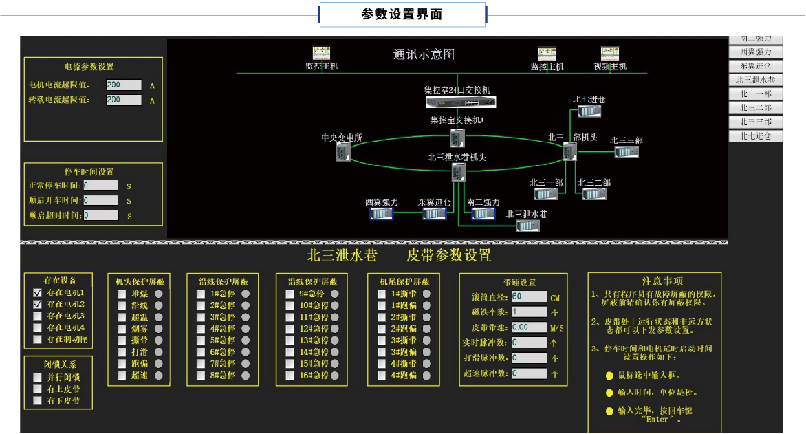 (1)皮帶沿線安裝語音通話設備,皮帶開車時沿線語音給出“設備啟動請工作人員注意”,保護動作時給出聲光提示“XXX保護動作”。