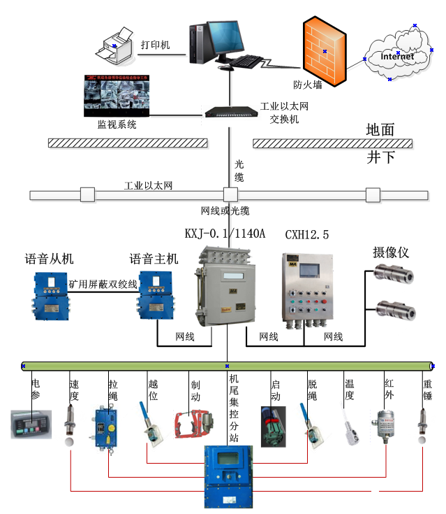本控制系統(tǒng)主要由礦用PLC控制箱、甩道控制分站、保護傳感器、預(yù)警通話系統(tǒng)、視頻監(jiān)控系統(tǒng)等組成。下圖 是整個系統(tǒng)的硬件組成圖
