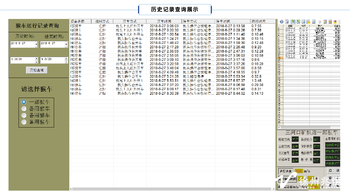 能夠通過地面計算機或井下就地箱上的顯示屏顯示架空乘人裝置的運行狀態(tài)(動態(tài)畫面);能夠顯示電動機或整個運行系統(tǒng)的主要參數(shù)(包括電機電流、運行速度、運行時間等參數(shù));顯示保護傳感器動作的位置和故障信息等。
